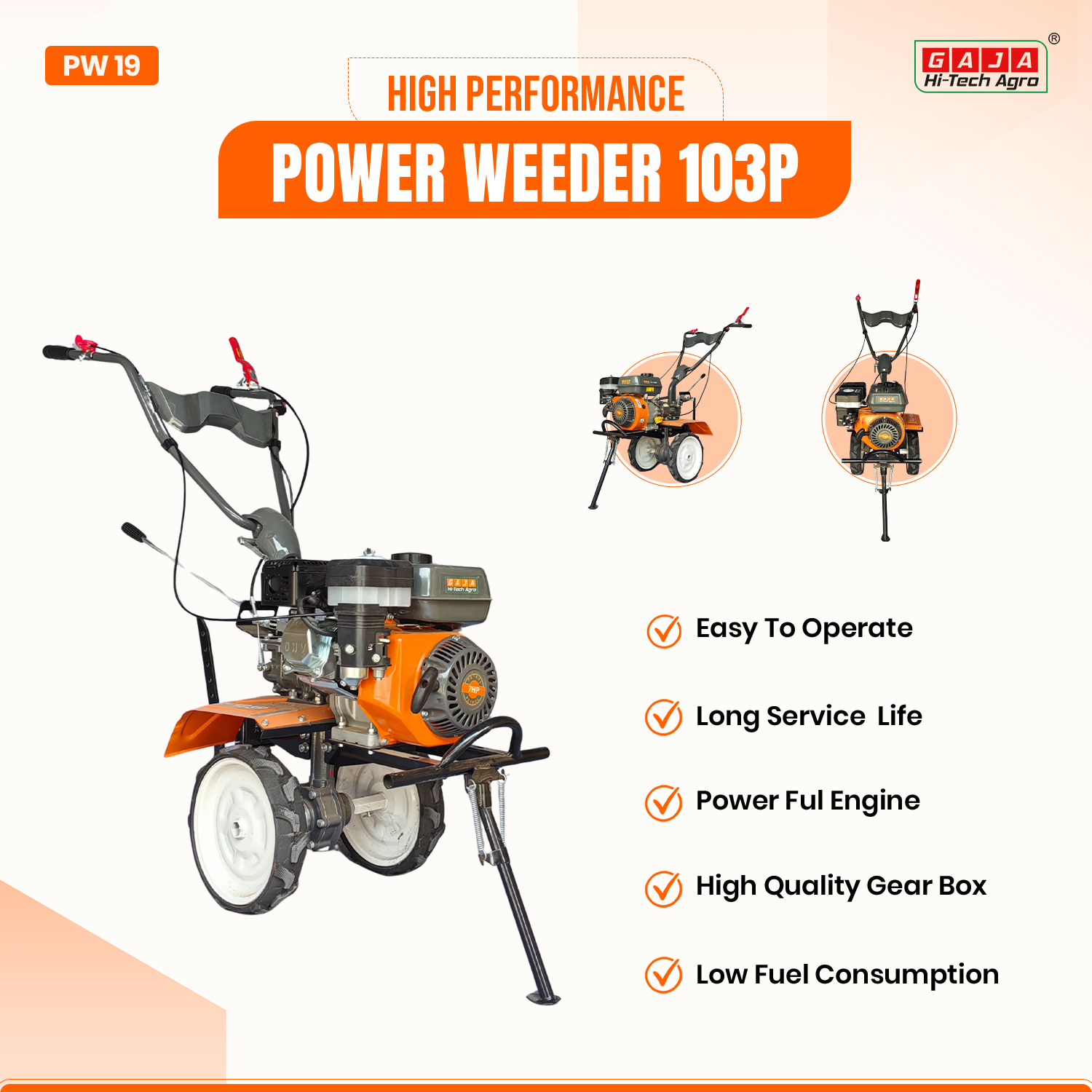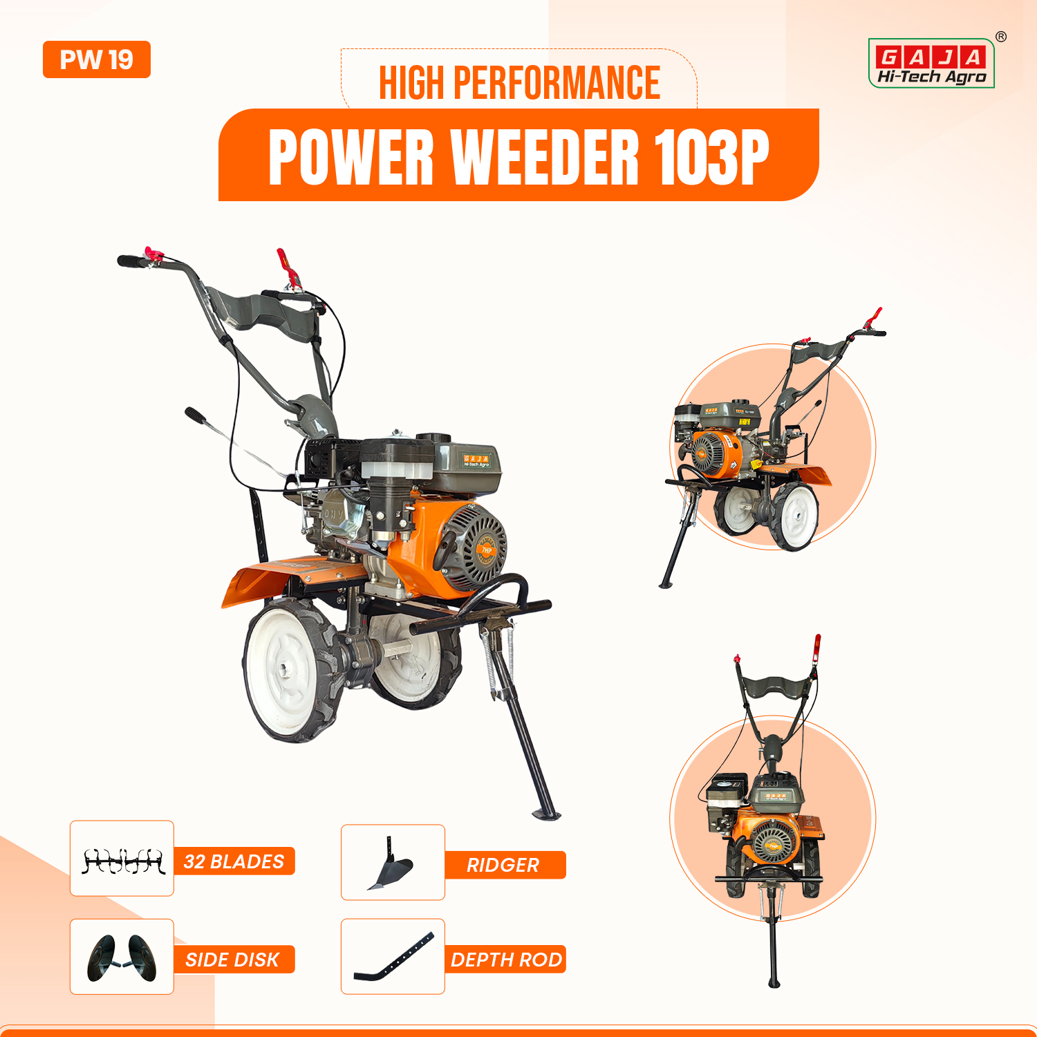 The GJ-103P Power Weeder is a compact and powerful agricultural mini tiller designed for efficient soil cultivation and weed removal. Powered by a reliable 4-stroke petrol engine delivering 4.8kW at 3600rpm with 212cc displacement, this power weeder ensures smooth performance for inter cultivation, soil loosening, and weed control.
